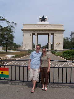 Akwaaba from Ghana! We are here safe and sound after about 30 hours of traveling. We had a fun filled day yesterday visiting the market in Accra. We have a great friend here named Dela. He has shown us around and let us stay at his house with his family. We are adjusting to the heat and humidity. The temperature has been about 80 degrees at night and 90 degrees during the day. We have also had some awesome rains storms which cool things off a bit. Purified water is about 4 cents in a half liter bag so we buy lots of that. We went to Independence square yesterday where they celebrate Ghanaian independence every year. They just celebrated 50 years of independence in March. We have eaten some authentic food which we are getting used to. They eat lots of bread and eggs, fish, beans and rice and fruit. Today we went out exploring and found a local soccer match going on. The people are all so friendly and welcome us everywhere. Here in Accra there are more visitors and things are very busy. Traffic in the city can be very bad. We are trying to soak everything up here for 3 more days until we head to Cape Coast. We love you all!